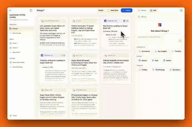 Symbolic’s enhanced research capabilities now enable users to perform sophisticated AI actions on document collections within their Library. An entire Collection can now be added directly to the research space. Users can then perform quick action shortcuts or engage in a dynamic dialogue of open-ended questions with that Collection This enables advanced search of or in-depth research on large document sets.