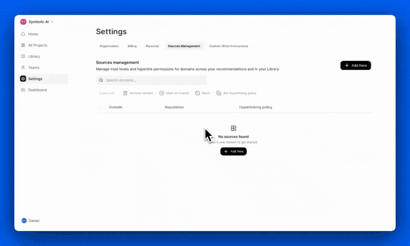 “Sources Management” is now located in the Settings tab of each Organization. Sources management enables organizations to apply trust criteria to any domain. Domains can be categorized as “trusted,” “blocked,” or “neutral,” and a specific hyperlinking policy can be assigned accordingly. Once a domain is included as a source, those trust criteria will be applied to all subsequent projects across the entire organization.