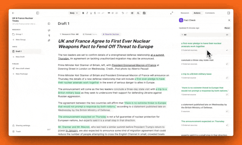 Yesterday evening, we introduced a highly anticipated upgrade to our platform: Fact Checking. Specifically designed for publishers who must get every fact right, this enhancement allows Symbolic users to exercise complete control over verification and trust, ensuring information reliability. Writers and editors can efficiently navigate any document—whether it’s composed on Symbolic or off—and extract facts and claims. These can then be cross-referenced with curated sources in Research, pre-designated Trusted Sources, or through the web. Verification of facts happens in a straightforward, checklist manner. Editors can also decide to add a link reference to any fact with one click. This end to end process significantly boosts productivity and streamlines a traditionally taxing editorial process.
