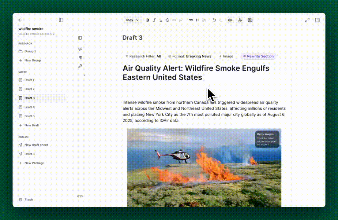 The Symbolic Editor menu bar now includes a "+ Image" option. Clicking this will call up the Image menu and search bar. The search bar pre-populates with the project name, and a preliminary group of relevant editorial images. Within the Getty Images tab, users can search editorial or creative images by topic, sort by various criteria, and view thumbnails and associated metadata. Clicking "Import Preview" will deliver a full-size, low resolution version of the image to the draft so it can be viewed in line. (Note: this is a free preview. Billing occurs only on exporting and purchasing the image.) The image can be deleted from the draft by clicking on it and deleting.