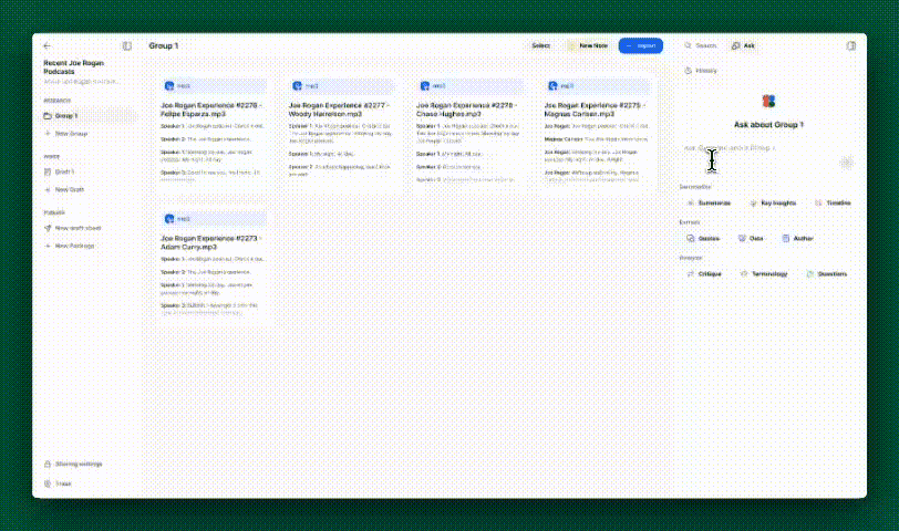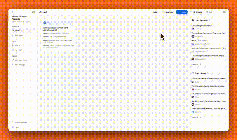 Symbolic now supports a range of media file formats, including MP4, MP3, WAV, and AAC. These file types can be added just like text files via the Import button in the Research space. Symbolic will automatically recognize a media file and initiate a transcript of the audio. The research card will then feature both the transcript and the audio, which can be played back through the media player at the top.