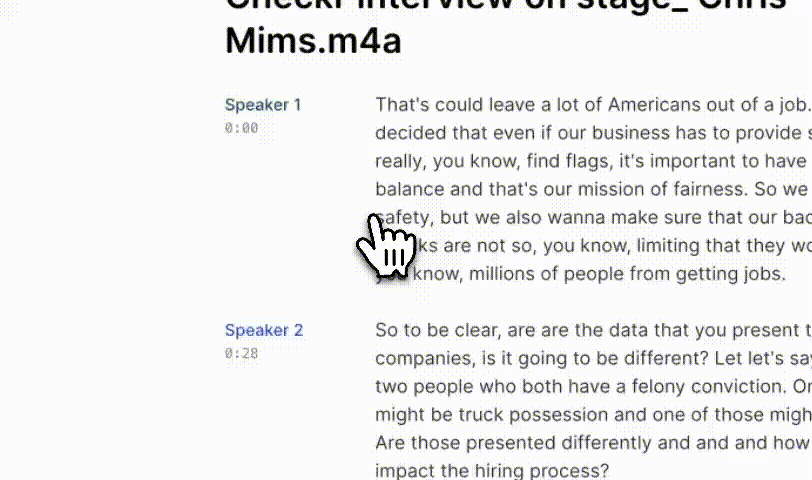 Once a file is transcribed, Symbolic adds tagging and metadata to make it easy to access and navigate. Multiple speakers will be identified as "Speaker 1; Speaker 2" ... which can be edited to include actual speaker names. All transcripts are time stamped, and clicking any time stamp will advance the audio to that exact moment.