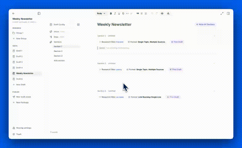 Symbolic last week introduced a much anticipated newsletter function, allowing drafts to be created by Sections. Each Section can carry its own research targeting, and its own format. Now, once each Section has been set up, a single "Write All Sections" button allows you to generate the entire document with a single click. Once the draft is generated, a user can accept the entire text, reject the entire text and try again, or go through Section by Section and accept or reject at that level. This saves time and effort, and gets to the end result faster.