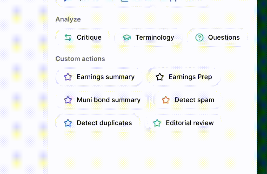 Enterprise customers of Symbolic have the opportunity to work with us on building and deploying custom actions. Several of our larger customers have very specific and sometimes complex tasks that they need executed as part of their publishing process. We have been able to work with them to reduce this complexity to agentic multi-step workflows, returning consistently high quality results. Examples of the type of actions that are currently in production include a) return a specific list of questions and answers concerning my research; b) separate incoming source content (automated through our internal API) into category types; c) extract certain facts from research (such as data), check those facts, and then write a short standardized note based on those facts.