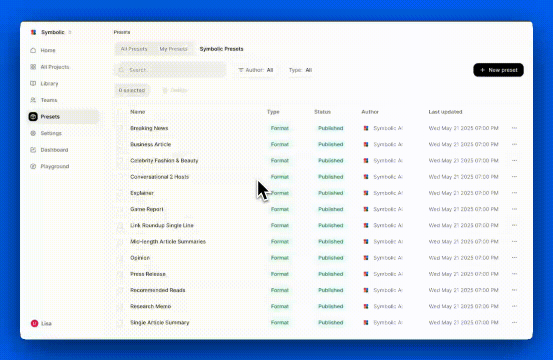 Symbolic has launched Presets, a new section of its app, located in the left main panel. The goal of Presets is simple but very powerful: to enable any Symbolic Organization to build and grow its institutional AI knowledge, and to make that knowledge available to every authorized user. Presets is a single place that holds saved voices, formats, and in the near future, templates. Through Presets, an Organization can manage, create and delete all of its instructions and permissions. This new central space shows all of the Presets that an organization has created, who created it, if it was published, and the date last modified. It enables search, sort, creation, iteration, and deletion.