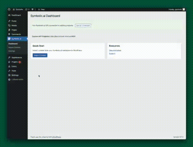 Symbolic now offers seamless integration with WordPress so that content created on Symbolic can be imported to any enterprise WordPress installation. This is delivered through a custom-built WordPress plugin which is available upon request. Once installed, activated, and authorized with your API key (more below), the plugin will guide you step by step to import a completed Symbolic project as a WordPress post. If you have selected a headline in Symbolic, it will be set as the WP post headline, and if you have selected a Symbolic summary, it will be imported as the excerpt in WordPress.