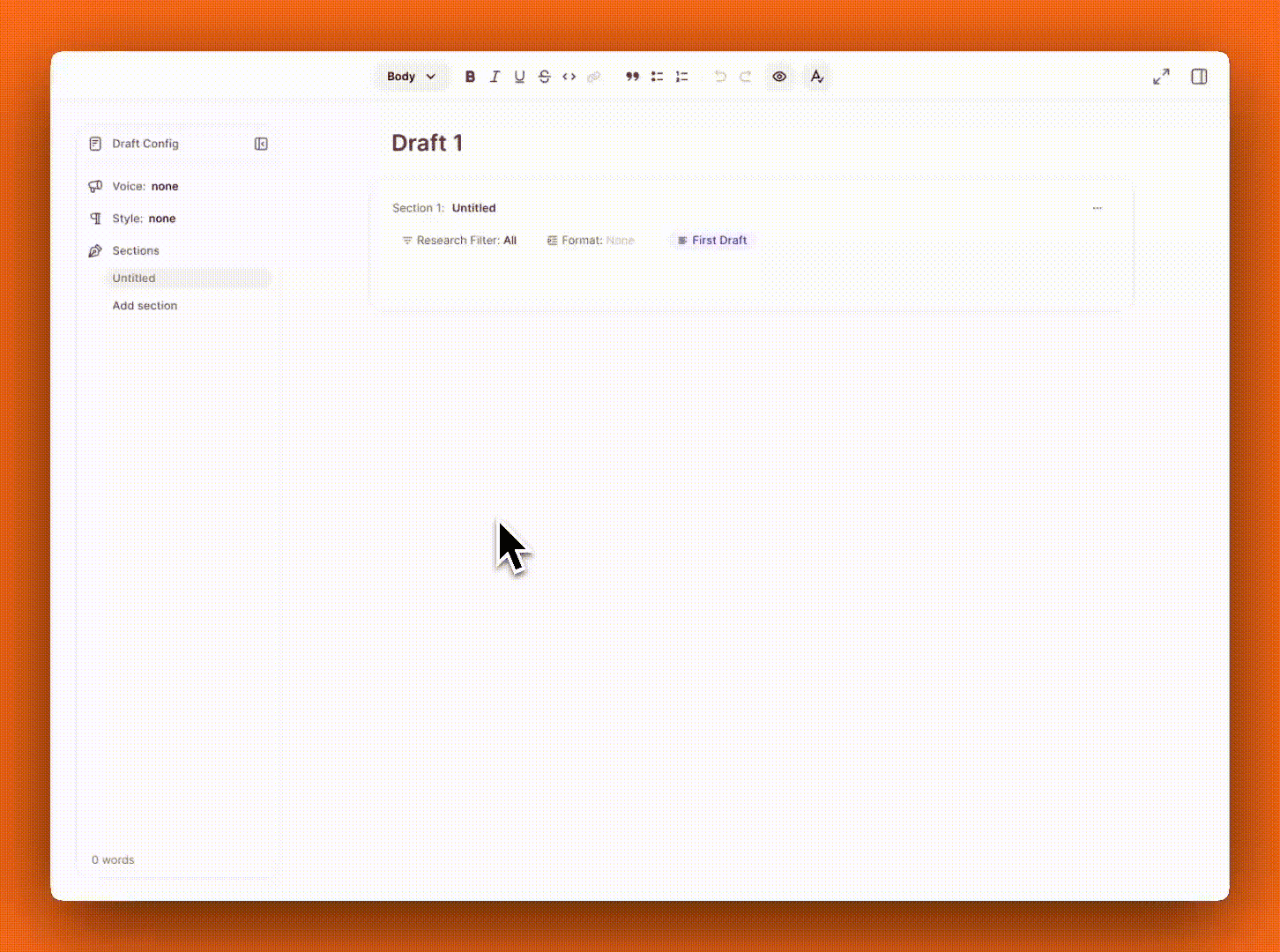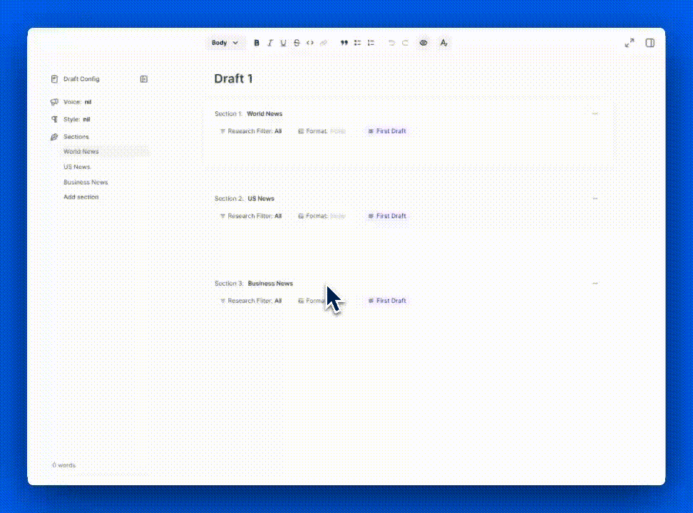 Each Section allows filtering research to specific tags. Once the filter is set, the AI for that Section will only consider the research with those tags. This method is quick, straightforward, and transparent, ensuring that source material is placed accurately. The AI then applies the appropriate voice and format to each Section. Once all the Sections have formats and assigned research, generating a draft is as simple as clicking “write first draft”. As with any draft within Symbolic, that draft can then be edited or modified as needed. The process of going from source content to a high quality newsletter typically takes under a minute.