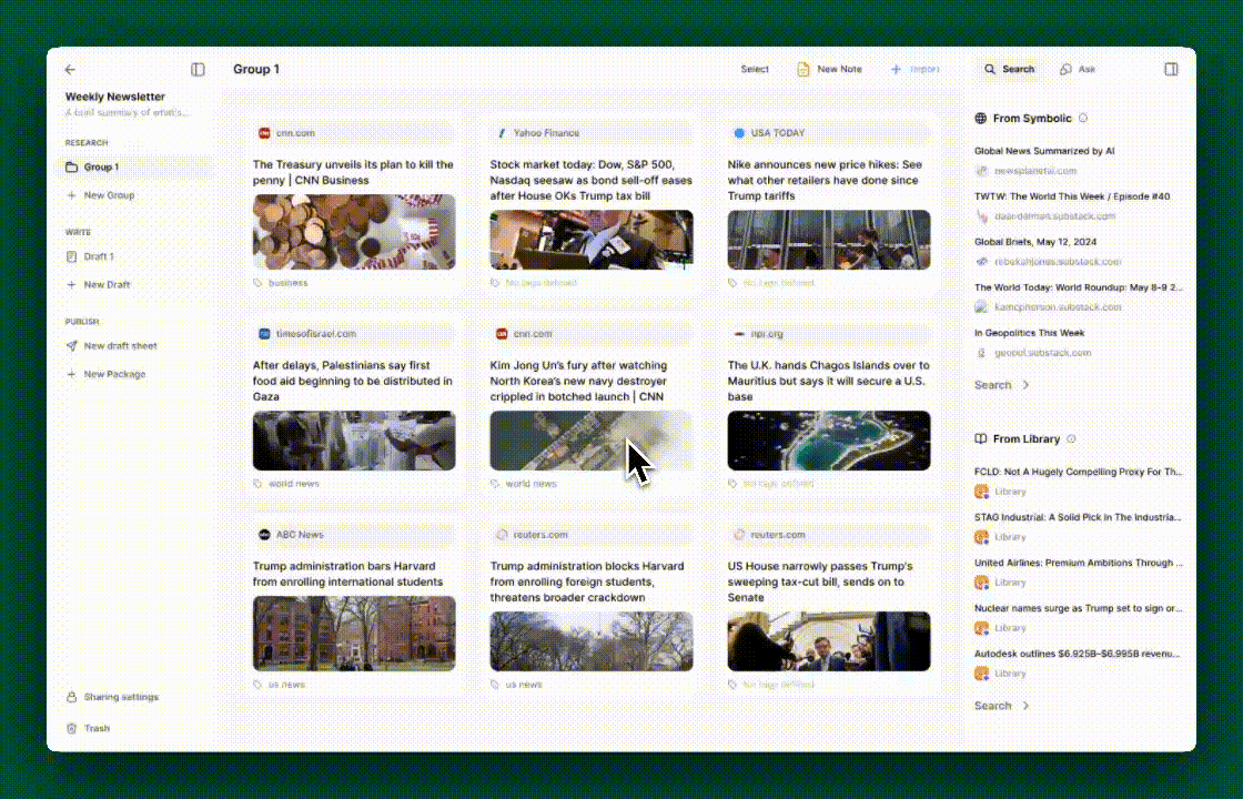 The first step to building a newsletter or briefing is to assemble its source content. Symbolics' research space is the perfect place for an individual or a team to curate that supporting material. Those sources can be previously existing or newly created, and can be imported through links, files, original notes, or through the Library (similar to any project on Symbolic). Team workflow is optimized; any member of a Team can add content, and then comment on or tag that content.
