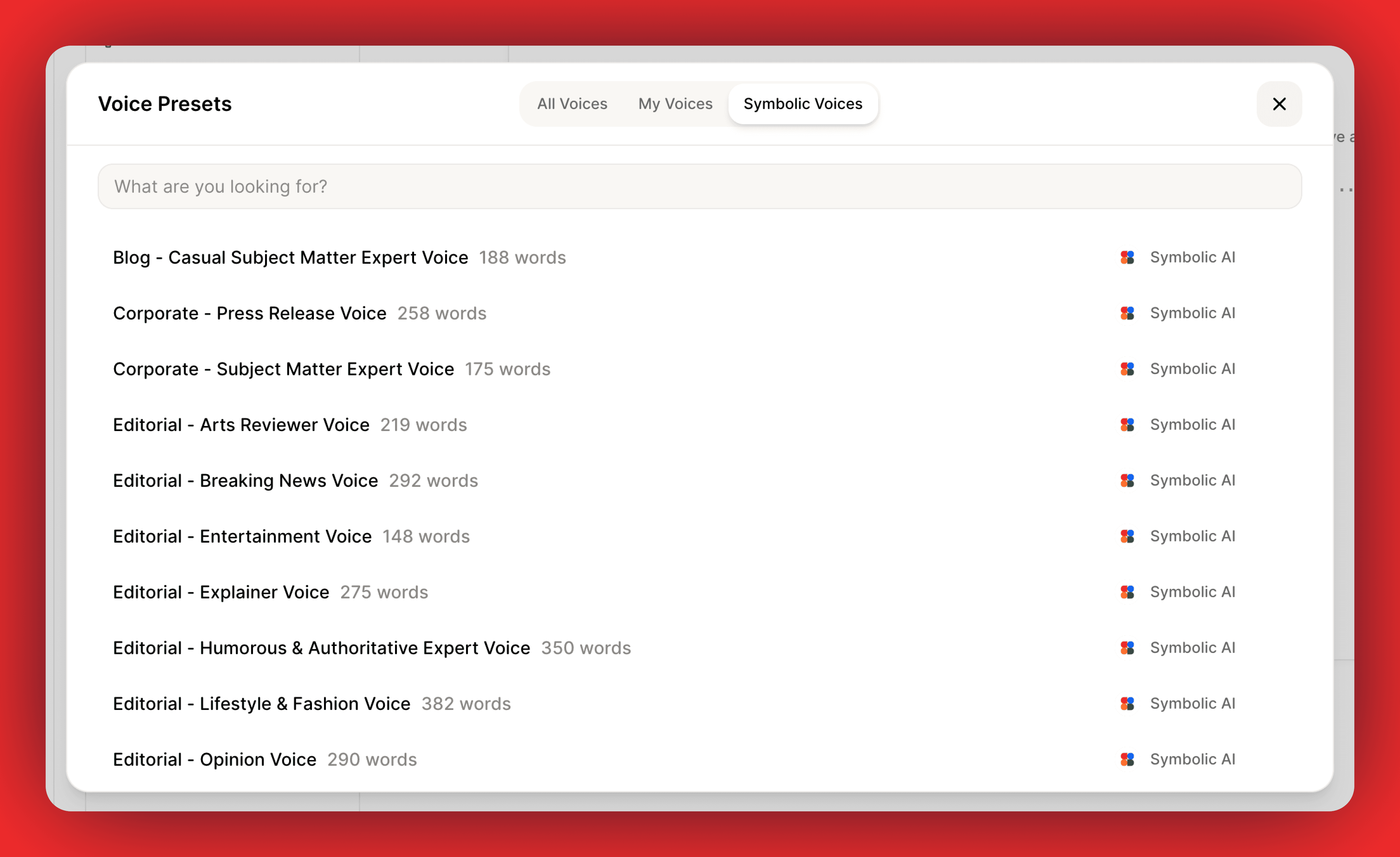 The modal that facilitates the creation of Voices and Formats now provides a new space to access all of those saved instructions. You can view “All” saved Voices and Formats, “My” saved ones (which are those you’ve personally created), or “Symbolic” Voices/Formats. The Symbolic presets are pre-configured instructions that cater to a variety of scenarios, including building blocks for newsletters. These presets can be selected and applied directly, and once applied, they can be customized further, re-saved, and reused. The Symbolic examples provide an excellent starting point, encouraging writers to experiment and adapt to any context required.