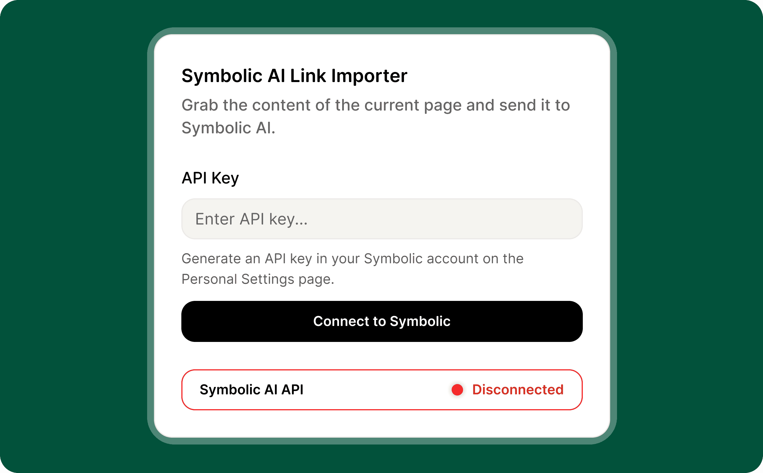 Once launched, the Symbolic AI Chrome extension will ask you to connect your Symbolic account. Simply paste in your API key, and you'll be able to import content directly into a Project or your Library with one click.